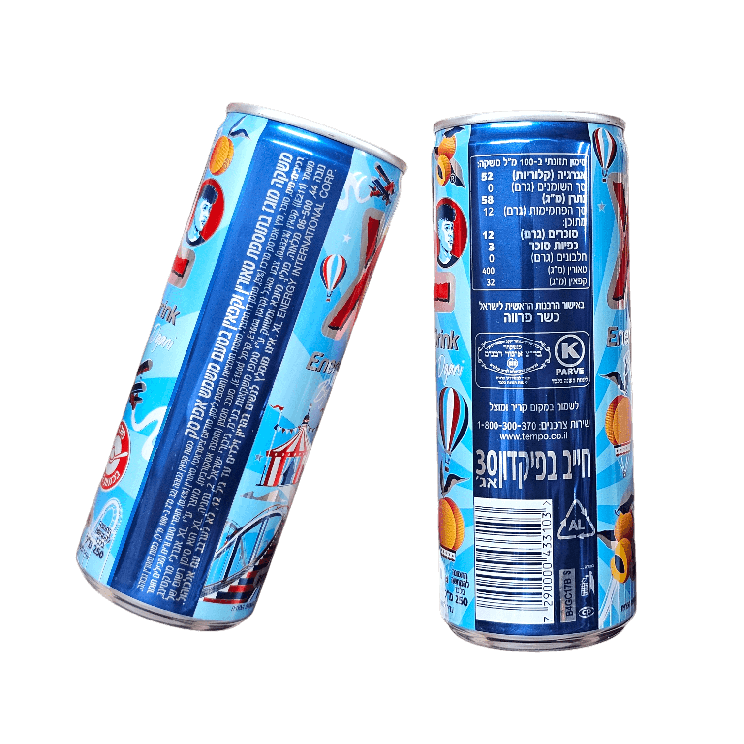 סוכר. 250 מ"ל. משקה אנרגיה מוזג בטעם משמש אפרסק בתוספת טאורין וקפאין