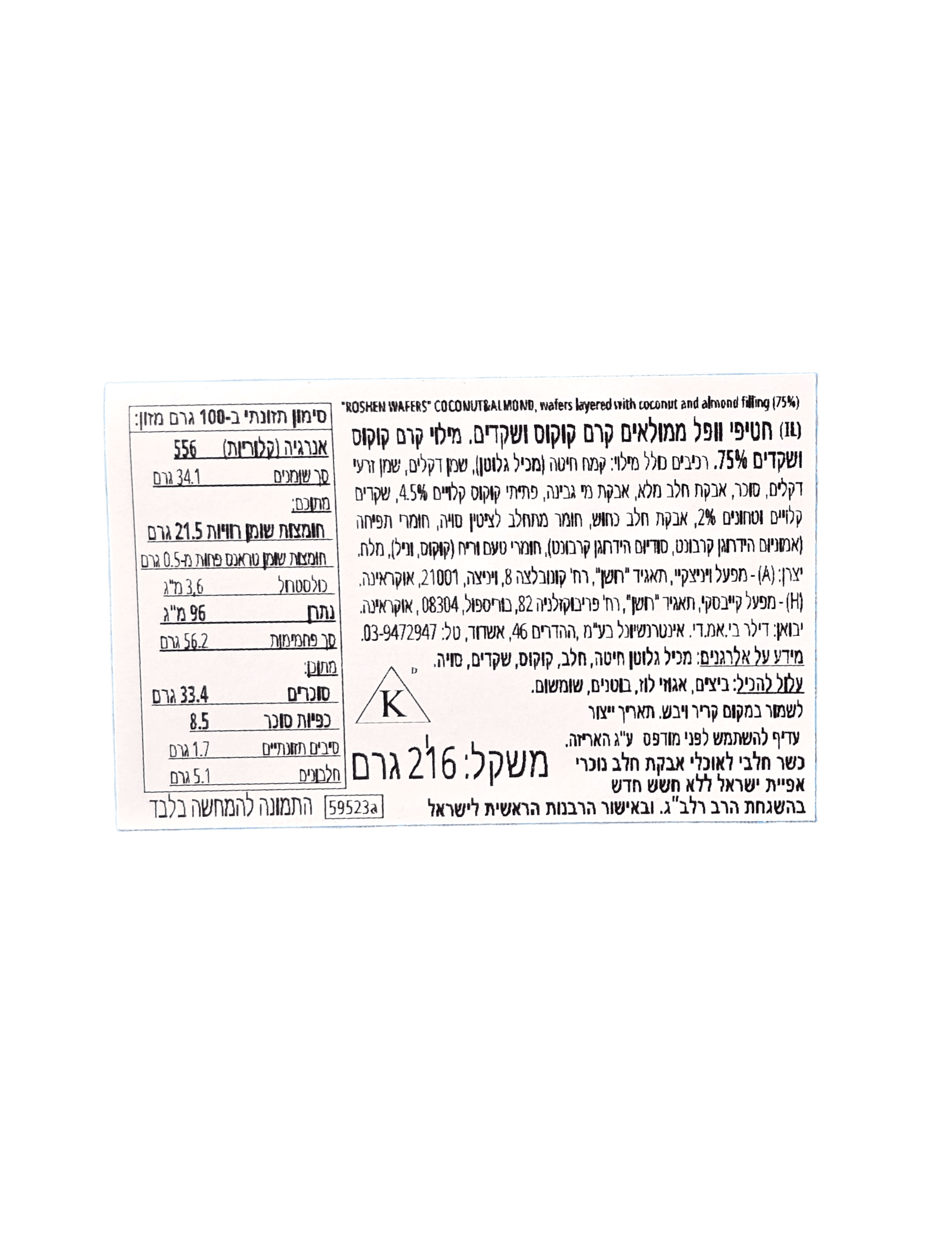 שומן. סוכר. 216 גרם. וופלים ממולאים קרם קוקוס ושקדים