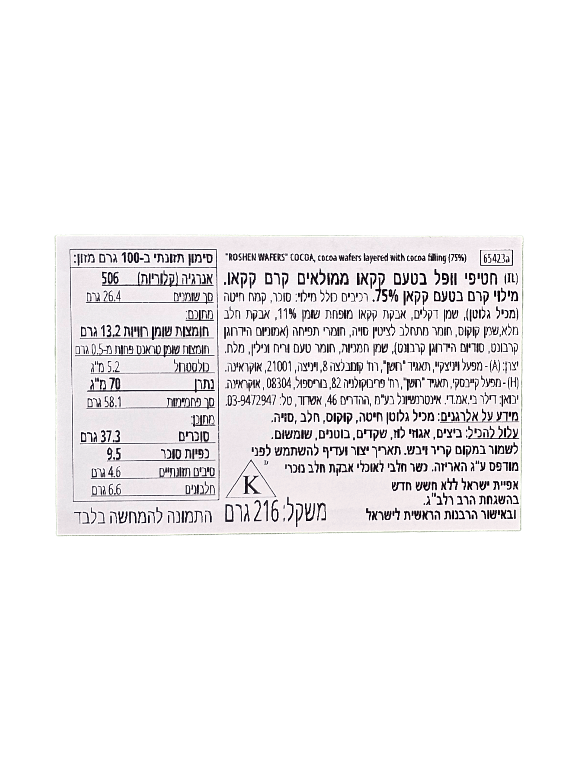 שומן. סוכר. 216 גרם. וופלים בטעם קקאו ממולאים קרם קקאו