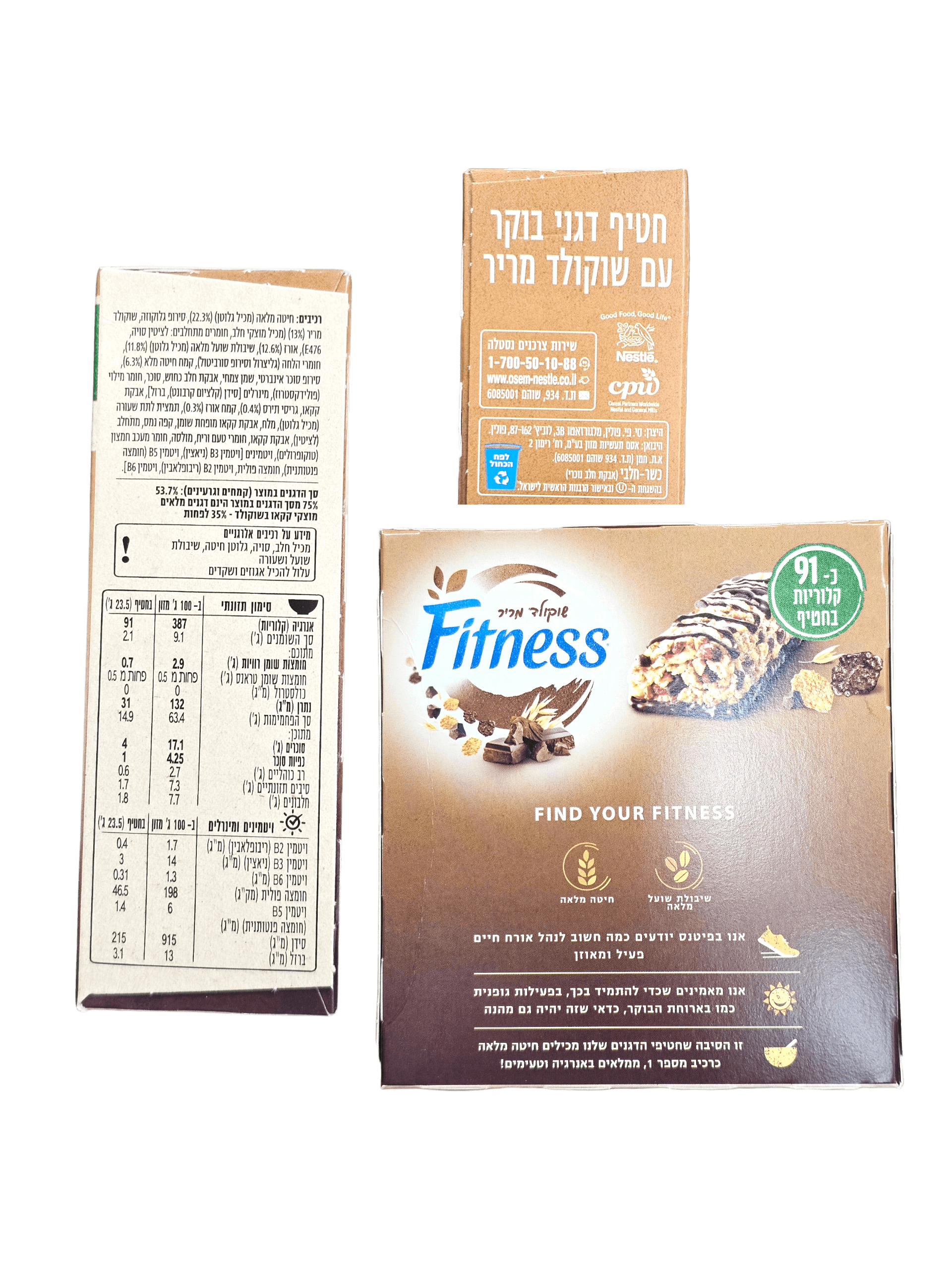 סוכר. 141 גרם. 6 יחידות חטיף דגני בוקר עם שוקולד מריר