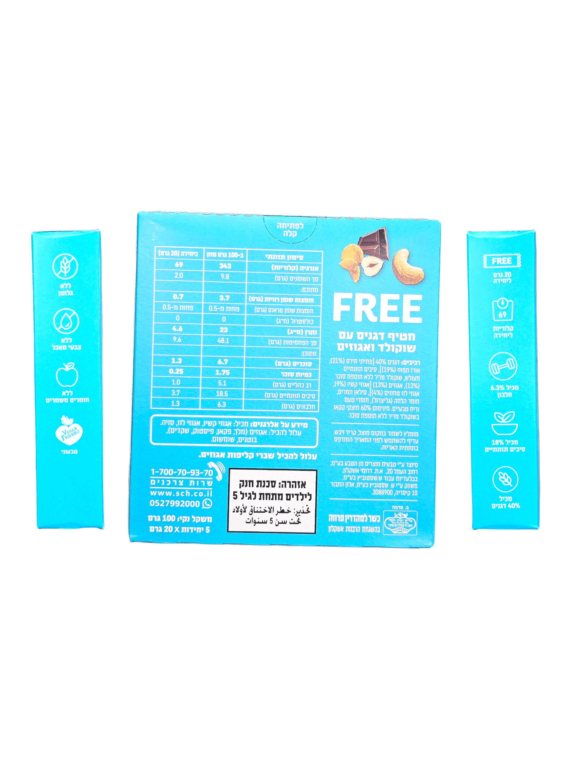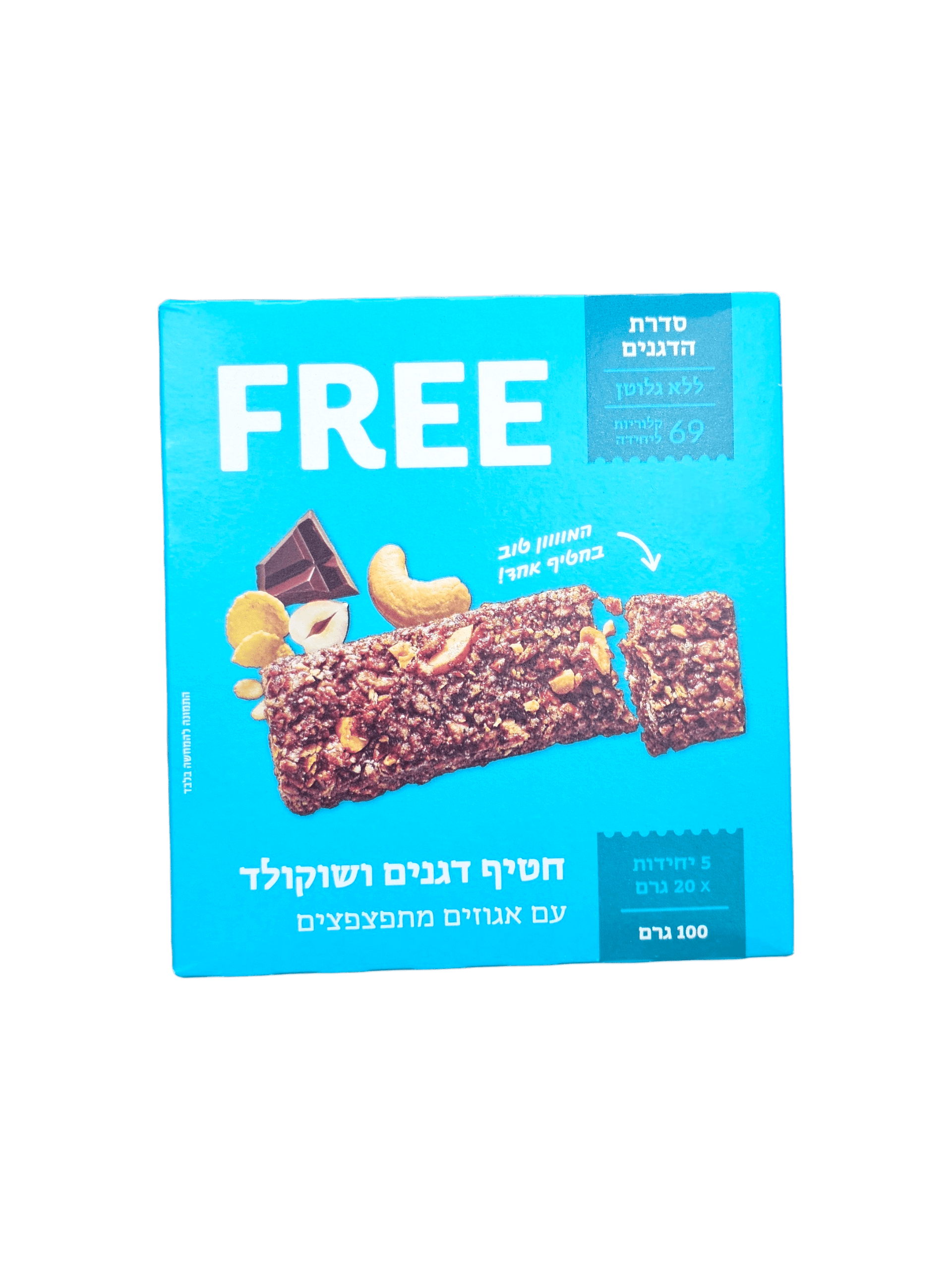 100 גרם. 5 יחידות חטיף דגנים עם שוקולד ואגוזים מתפצפצים