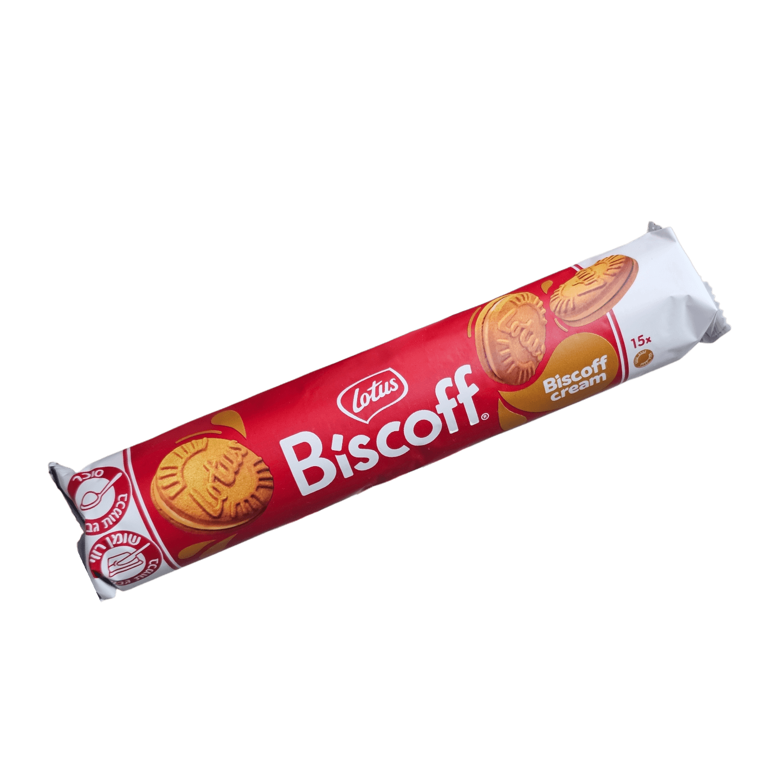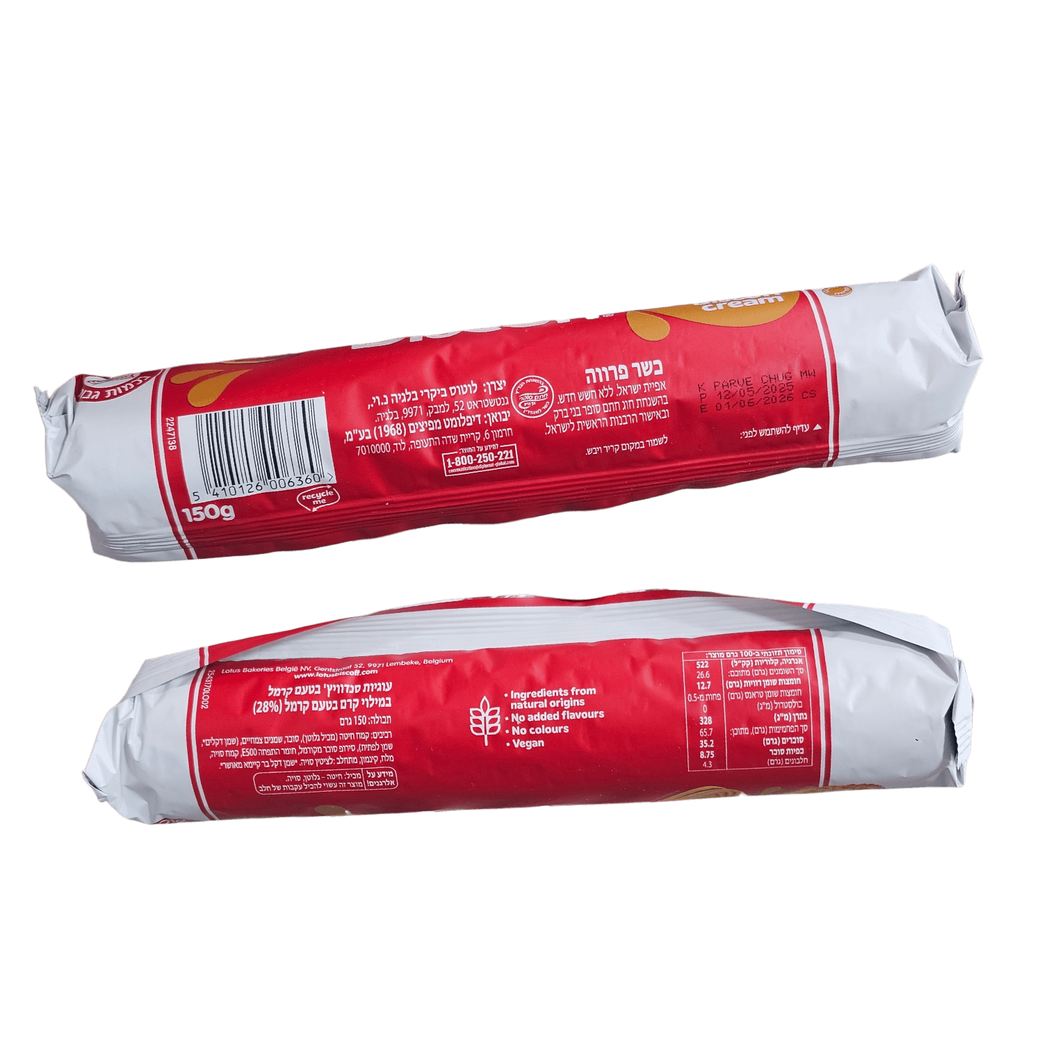 שומן. סוכר. 150 גרם. עוגיות סנדוויץ' בטעם קרמל במילוי קרם בטעם קרמל