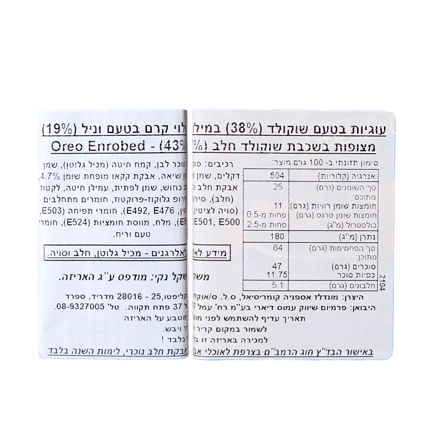 שומן. סוכר. 246 גרם. עוגיות בטעם שוקולד במילוי בטעם וניל מצופות בשכבת שוקולד חלב
