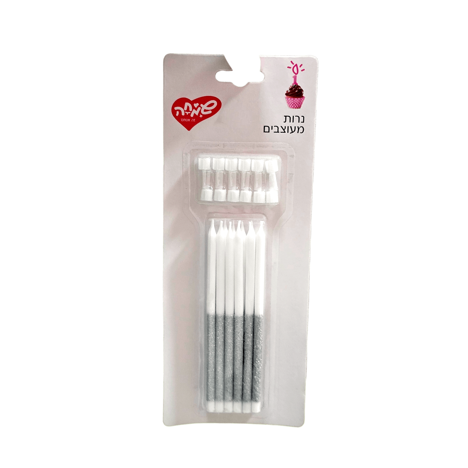 12 יחידות. נרות מעוצבים בצבע כסף מנצנץ ולבן