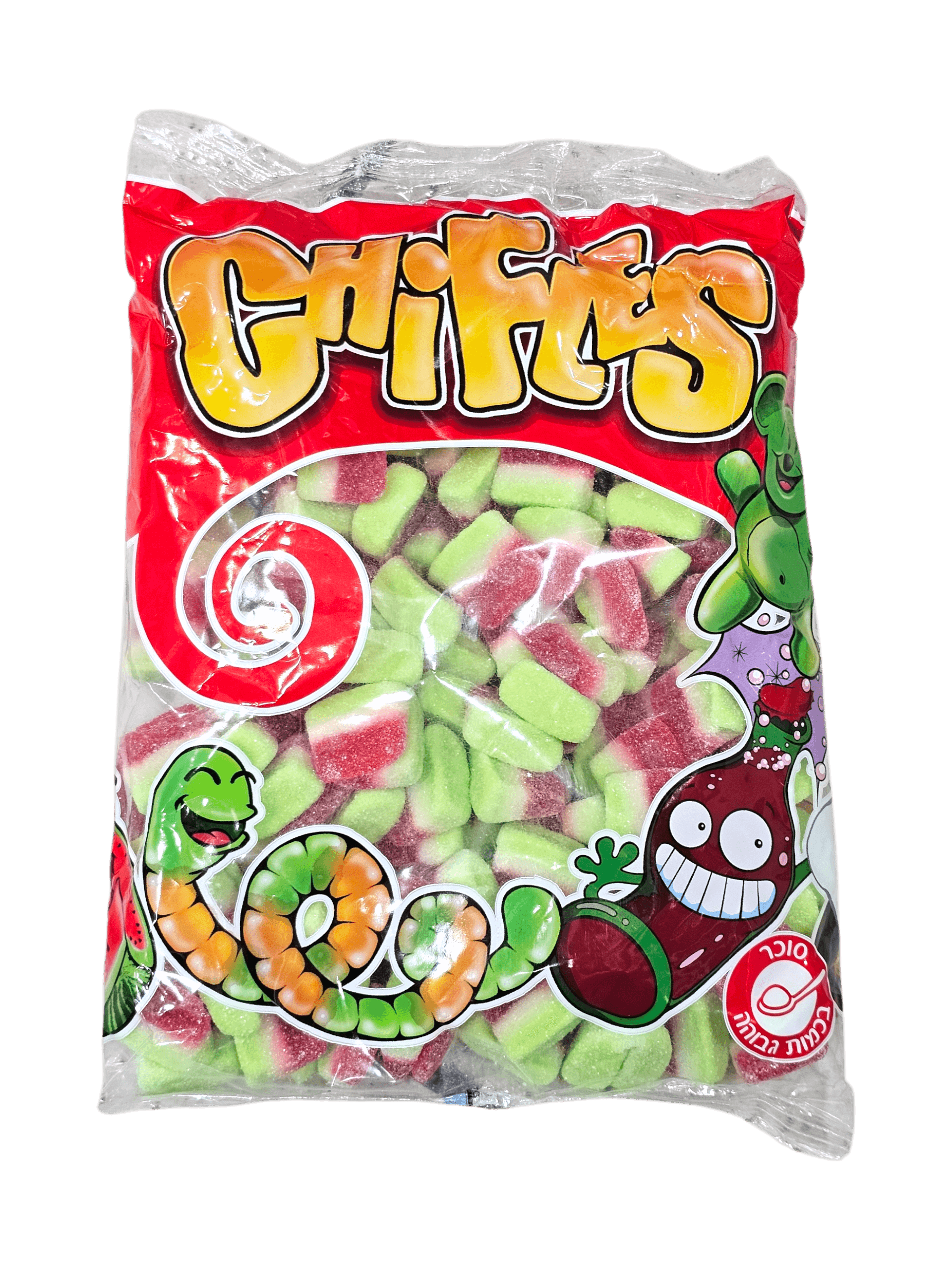 סוכר. 1 קילו. סוכריות גומי בטעמי אבטיח בצורת פלחי אבטיח מסוכרים